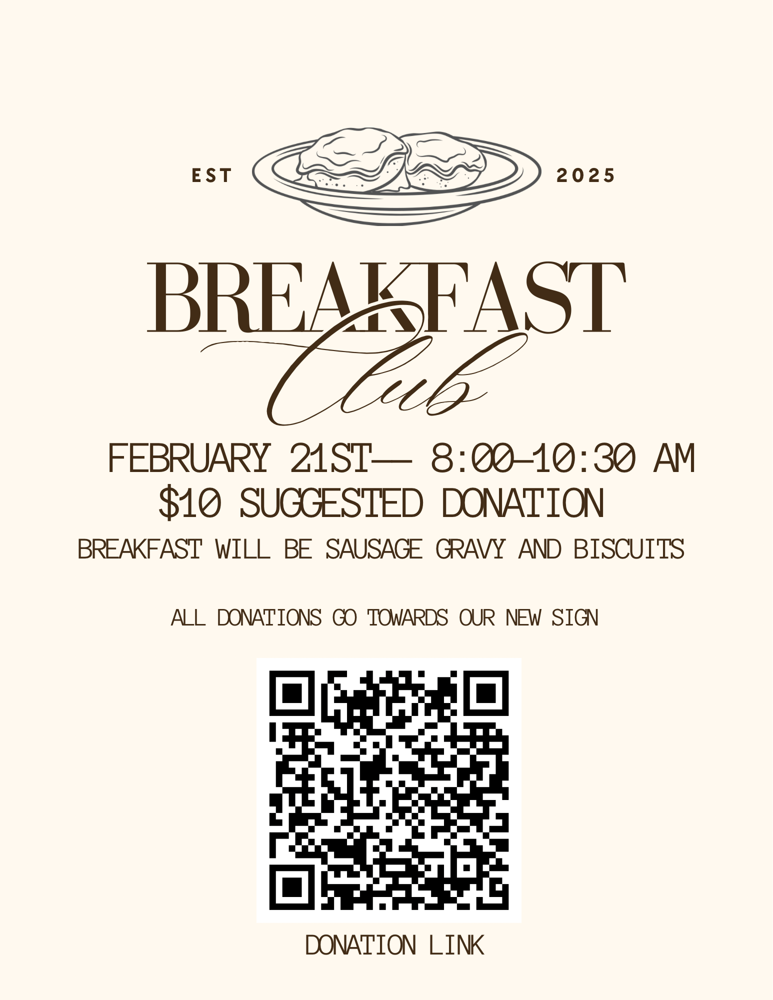 Are you part of the Breakfast Club? We’d love to have you! What do you need to do to join this club? Simply show up and get some food, simple as that! February 21st, 8:00 - 10:30 AM. This month’s breakfast will be biscuits and sausage gravy.